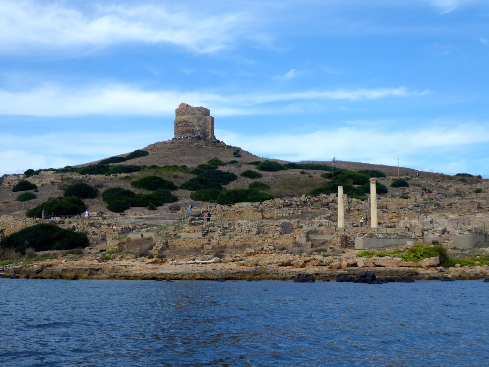 Tharros… Not a town but an archeological site (more old rocks!). We hooked on to a mooring ball and lost it just as fast, as well as our boat hook; the winds dragging us down wind. Kathy circled Inishnee around again. Giving another go at it, Jim was able to snag the float secure the lines and retrieve the boat hook. Off the bow, the ancient roman ruins of Tharros;with a couple of standing, marble columns. Just beyond on the crest of the hill sat a watch tower; one of thousands that skirt the island. Ashore we strolled into the tiny village comprised of restaurants and pensions. It didn't take long to explore so we retraced our steps and returned to Craic (our dinghy) for transport to Inishnee (our ship)…